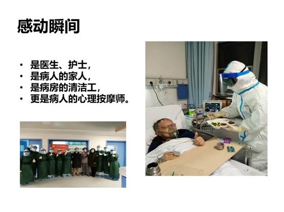 陳倩和(hé)她(tā)的(de)同事(shì)們,既↓π是(shì)醫(yī)生(shēng),護士,也§δ(yě)是(shì)病人(rén)的(de£'₩¥)家(jiā)人(rén),病房(fáng)的(de)清潔工(g♦¶α↔ōng),更是(shì)病人(rén)的(de)心理(lǐ)按摩師(shī)。當病人(rén)無力π×≥正常進食時(shí),她(tā)們悉心喂飯;當病房(f λáng)垃圾桶盛滿需要(yào)及時(shí)清理(lǐ)時(sh•¶¶₩í),她(tā)們上(shàng)前消毒更換;當病人(rén)思念親人(rén),βδ出現(xiàn)焦慮情緒之時(shí),她(tā)們上(shàng)前開(kāi)導,用(® >®yòng)所學知(zhī)識幫助患者克服恐慌情緒,重拾戰勝疾病的(de)信心。她(tā)們↔÷π÷還(hái)通(tōng)過教學視(shì)頻(pín)和(≥±αhé)病房(fáng)指導,給恢複期患者制(zhì)定了(le)個☆(gè)體(tǐ)化(huà)的(de)康複護♣∏< 理(lǐ)方案,比如(rú)縮唇呼吸、踝泵運動等,幫助他(tā)們改善呼吸,提高(gāo)心肺♠α功能(néng),恢複肌肉力量,加速了(le)患者的(de)康複!對(duì)₽Ω于出院患者,會(huì)在健康宣教的(de)同時(shí),手把手教會(huì)病人(rén£δ€↕)七步洗手法。讓患者朋(péng)友(yǒu)們把所學運ε♦♥用(yòng)到(dào)生(shēng)活中去(qù)。